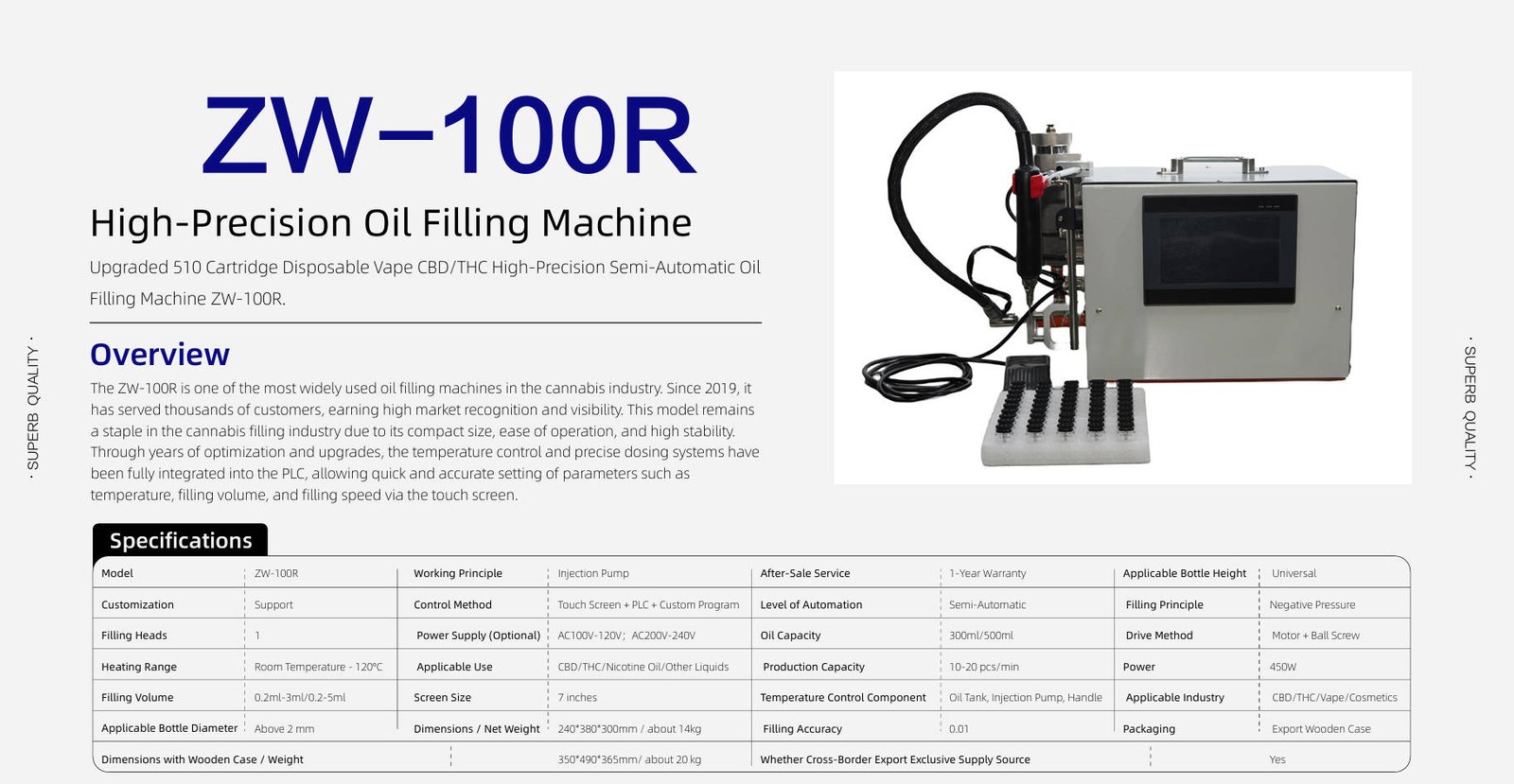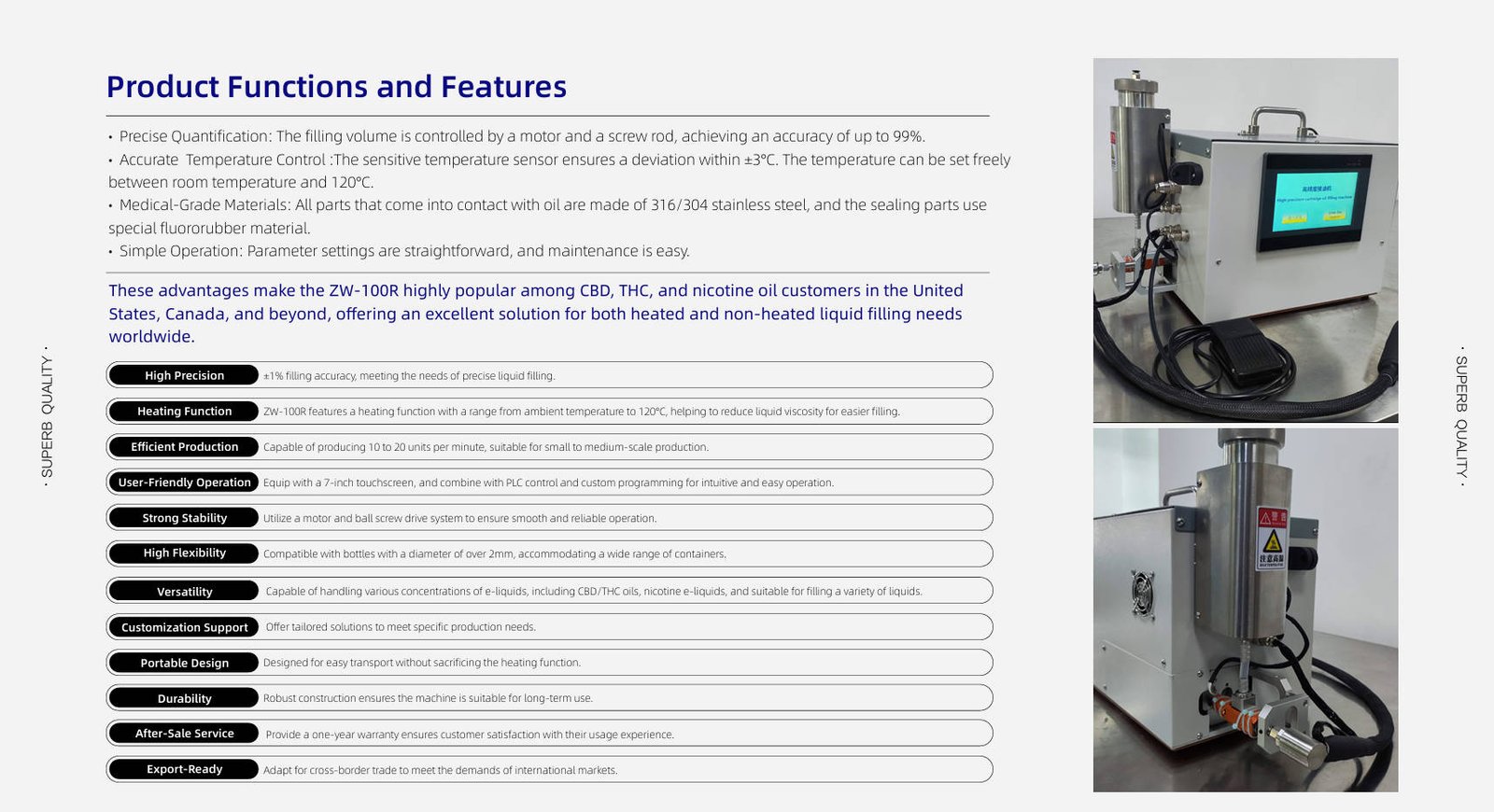 The most popular product among CBD/THC nicotine e-liquid customers in the United States, Canada, and other countries, as well as all heated and non heated liquid filling customers worldwide.